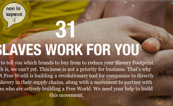 Fonte SlaveryFootPrint Eh si … Fa paura sentirselo dire ma i nostri comportamenti generano schiavitù .. I vestiti che indossiamo, i gioielli che portiamo, la tecnologia che adoperiamo, tanti dei nostri acquisti non fanno “bene”. Non ne avevo un idea fin quando ho fatto questo test, ma naturalmente con le […]